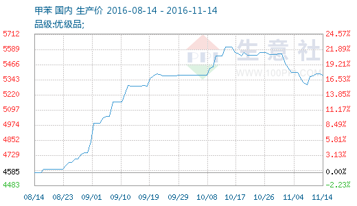 據(jù)監(jiān)測:11月14日海內(nèi)甲苯市場震蕩運行。國際方面:美國WTI原油12月期貨周五(11月11日)收跌1.25美元,或2.80%,報43.41美元/桶,本周下跌2.04%。布倫特原油1月期貨周五收跌1.09美元,或2.38%,報44.75美元/桶,本周下挫2.22%。石油輸出國組織(OPEC)和國際能源署(IEA)最新發(fā)布的月報均產(chǎn)生較大利空影響,同時美國石油活躍鉆井數(shù)也繼承晉升,供給過剩憂慮持續(xù)升溫令市場對限產(chǎn)遠景偏向悲觀。油價大幅收跌,電子盤走軟,上周末整個芳烴版塊推漲帶動甲苯市場上揚,但本周初需求偏弱。場內(nèi)廠家多謹嚴觀望,整體交投氛圍較為平淡。而下游采購需求跟進乏力,進入傳統(tǒng)淡季,后續(xù)表現(xiàn)一般。生意社分析師以為甲苯市場短期內(nèi)將窄幅收拾整頓運行。
