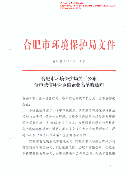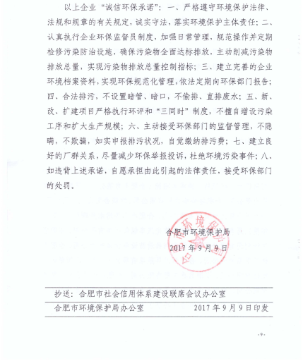 公司被評為合肥市誠信環(huán)保承諾企業(yè)